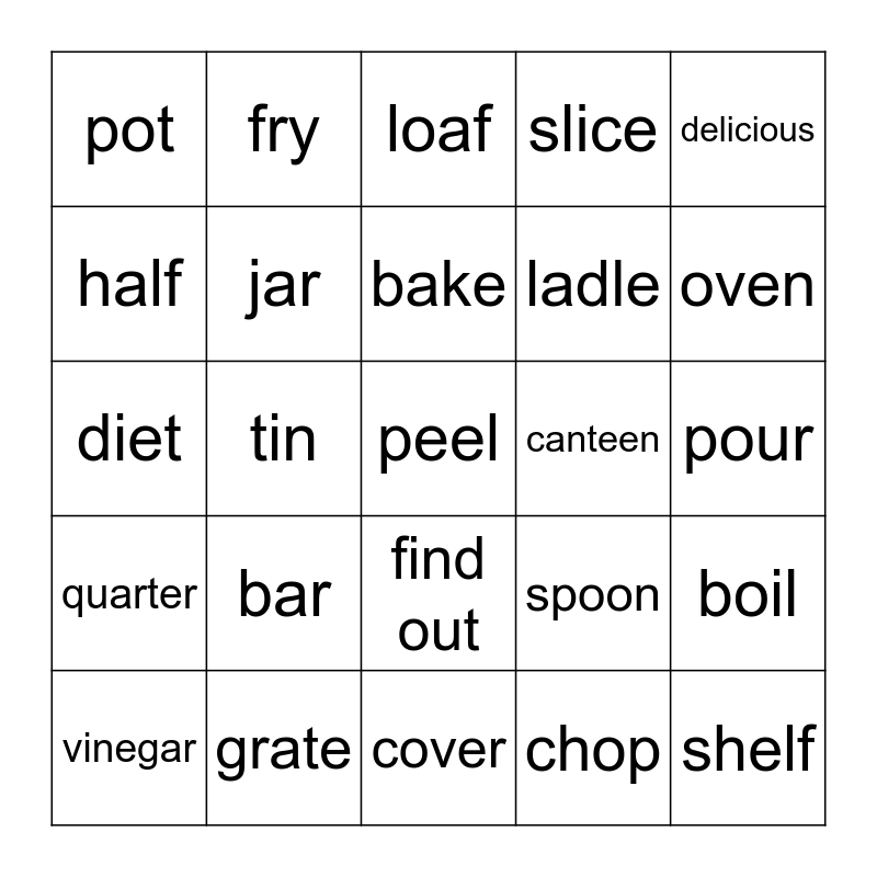 This bingo card has a free space and 29 words: vinegar, bunch, tin, can, pot, loaf, jar, bar, canteen, grate, pour, shelf, cover, chop, oven, fetch, find out, quarter, delicious, diet, spoon, tramp, ladle, half, slice, fry, boil, bake and waiter.