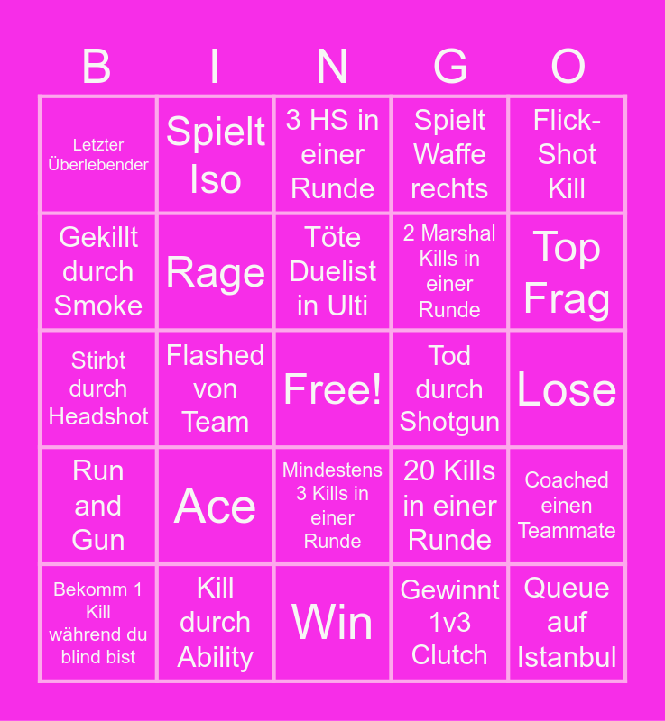 This bingo card has a free space and 24 words: Ace, Kill durch Ability, Töte Duelist in Ulti, Bekomm 1 Kill während du blind bist, Flick-Shot Kill, Letzter Überlebender, Gekillt durch Smoke, Spielt Iso, Tod durch Shotgun, Mindestens 3 Kills in einer Runde, 2 Marshal Kills in einer Runde, Stirbt durch Headshot, 20 Kills in einer Runde, Coached einen Teammate, Rage, Gewinnt 1v3 Clutch, Lose, 3 HS in einer Runde, Top Frag, Flashed von Team, Queue auf Istanbul, Run and Gun, Spielt Waffe rechts and Win.
