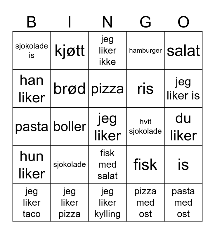 This bingo card has 38 words: egg, yogurt, donut, brød, is, sjokolade, pizza, kjeks, salat, ris, boller, hamburger, jeg liker, du liker, han liker, hun liker, jeg elsker, jeg liker ikke, du liker ikke, hvit sjokolade, sjokolade is, jeg liker pizza, jeg liker is, jeg liker taco, jeg liker kjøtt, jeg liker kylling, pasta med ost, pasta med kjøtt, kjøtt med salat, brød med ost, brød med egg, fisk med salat, pizza med ost, kjøtt, kylling, fisk, pasta and ost.