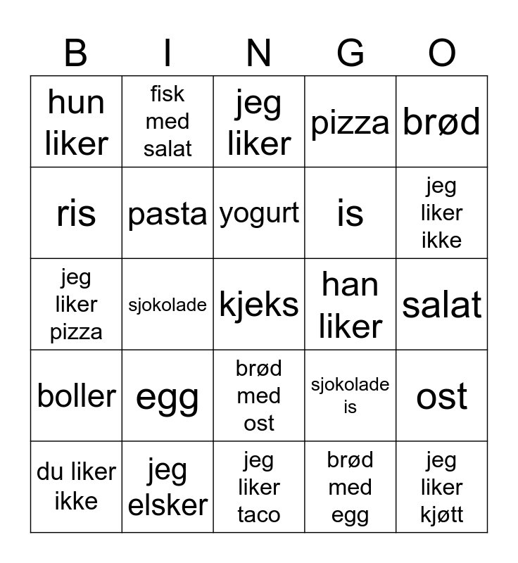 This bingo card has 38 words: kjøtt, kylling, fisk, pasta, ost, egg, yogurt, donut, brød, is, sjokolade, pizza, kjeks, salat, ris, boller, hamburger, jeg liker, du liker, han liker, hun liker, jeg elsker, jeg liker ikke, du liker ikke, hvit sjokolade, jeg liker taco, jeg liker kjøtt, jeg liker kylling, pasta med ost, pasta med kjøtt, kjøtt med salat, brød med ost, brød med egg, fisk med salat, pizza med ost, sjokolade is, jeg liker pizza and jeg liker is.