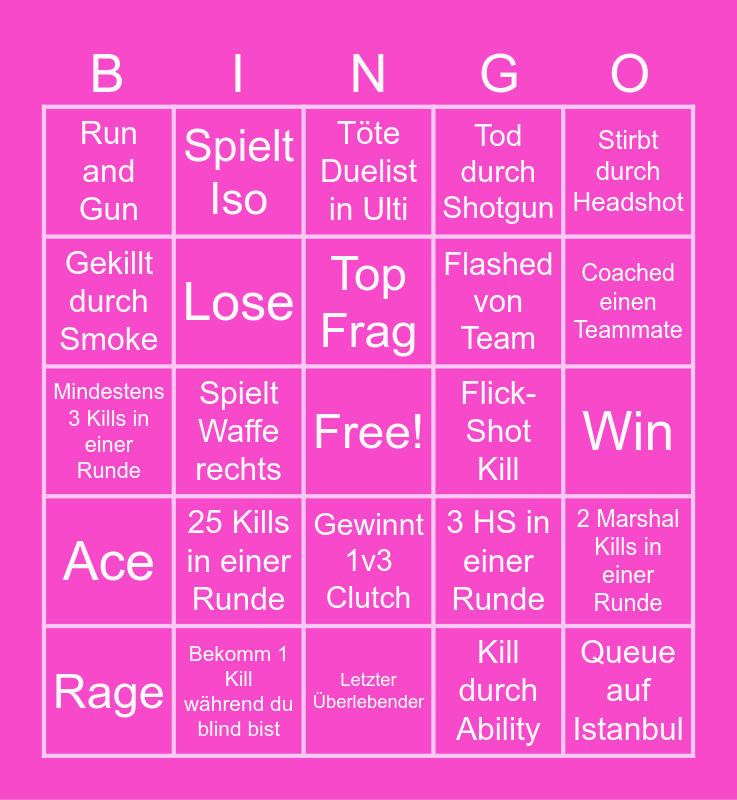 This bingo card has a free space and 24 words: 25 Kills in einer Runde, Bekomm 1 Kill während du blind bist, Top Frag, Rage, Stirbt durch Headshot, Run and Gun, Gekillt durch Smoke, Spielt Iso, Flick-Shot Kill, Gewinnt 1v3 Clutch, Flashed von Team, Mindestens 3 Kills in einer Runde, 3 HS in einer Runde, 2 Marshal Kills in einer Runde, Lose, Kill durch Ability, Win, Töte Duelist in Ulti, Coached einen Teammate, Spielt Waffe rechts, Queue auf Istanbul, Ace, Tod durch Shotgun and Letzter Überlebender.