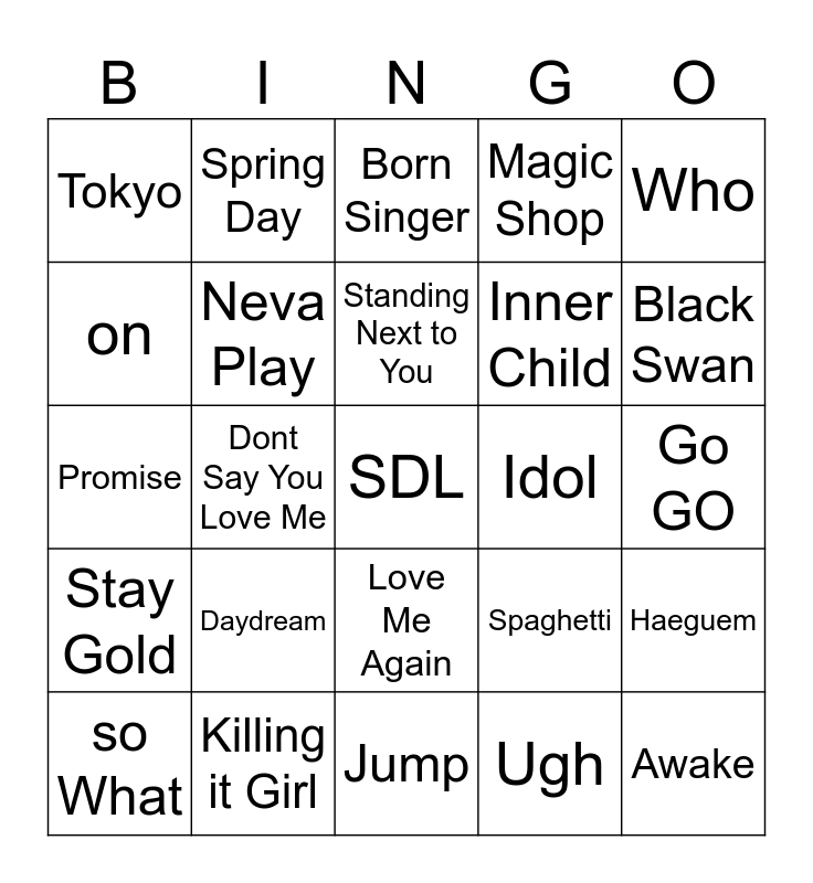 This bingo card has a free space and 24 words: Daydream, Killing it Girl, Standing Next to You, so What, Who, Tokyo, on, Spring Day, Idol, Love Me Again, Inner Child, Promise, Spaghetti, Haeguem, Neva Play, Ugh, Go GO, Born Singer, Black Swan, Dont Say You Love Me, Awake, Stay Gold, Magic Shop and Jump.