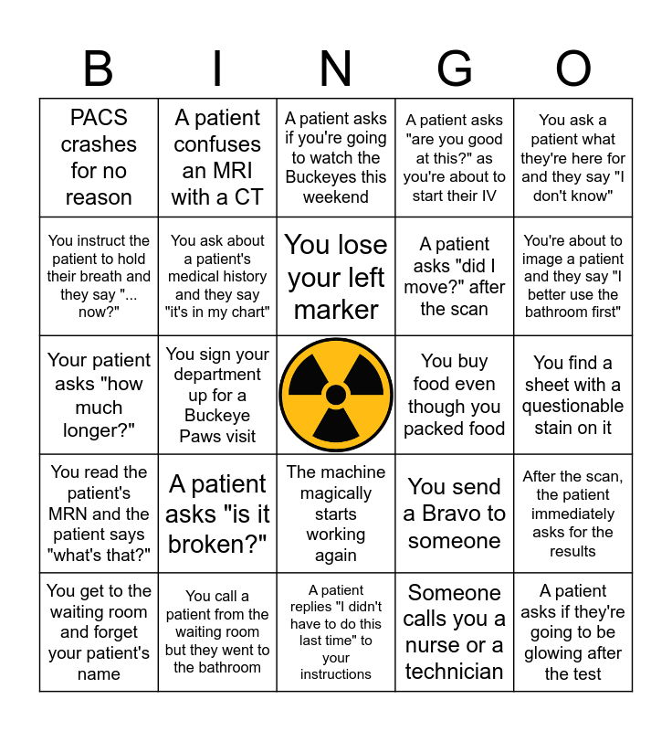 This bingo card has a free space and 24 words: A patient asks "is it broken?", You call a patient from the waiting room but they went to the bathroom, You lose your left marker, You get to the waiting room and forget your patient's name, You ask a patient what they're here for and they say "I don't know", PACS crashes for no reason, You instruct the patient to hold their breath and they say "... now?", A patient confuses an MRI with a CT, You buy food even though you packed food, The machine magically starts working again, A patient asks "did I move?" after the scan, Your patient asks "how much longer?", You send a Bravo to someone, After the scan, the patient immediately asks for the results, You ask about a patient's medical history and they say "it's in my chart", Someone calls you a nurse or a technician, You find a sheet with a questionable stain on it, A patient asks if you're going to watch the Buckeyes this weekend, You're about to image a patient and they say "I better use the bathroom first", You sign your department up for a Buckeye Paws visit, A patient asks if they're going to be glowing after the test, You read the patient's MRN and the patient says "what's that?", A patient asks "are you good at this?" as you're about to start their IV and A patient replies "I didn't have to do this last time" to your instructions.