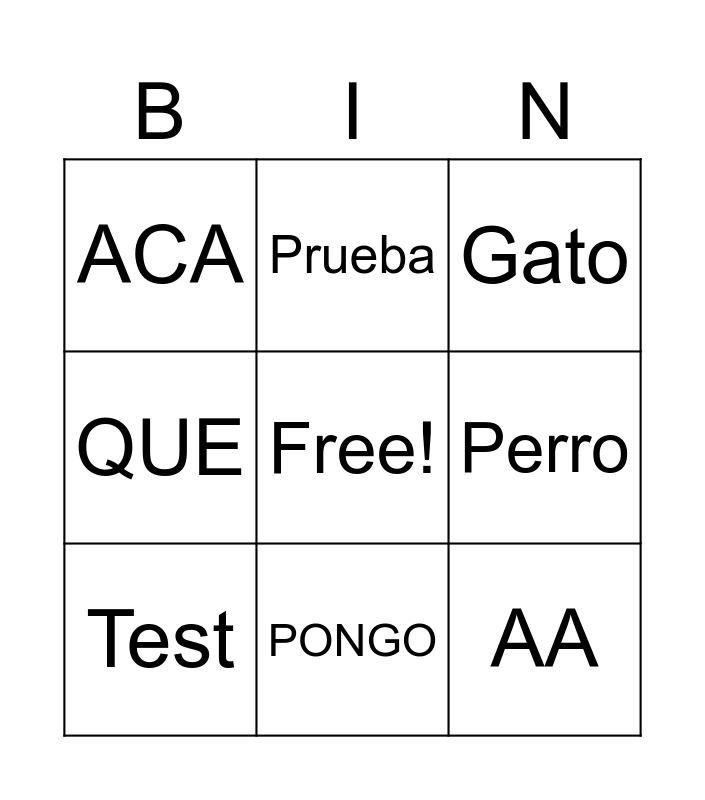 This bingo card has a free space and 8 words: Perro, Gato, Prueba, Test, ACA, AA, QUE and PONGO.