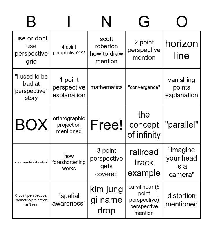 This bingo card has a free space and 24 words: how foreshortening works, "spatial awareness", mathematics, 0 point perspective/ isometric/projection isn't real, horizon line, use or dont use perspective grid, "i used to be bad at perspective" story, 4 point perspective???, the concept of infinity, 3 point perspective gets covered, "convergence", BOX, railroad track example, "imagine your head is a camera", 1 point perspective explanation, curvilinear (5 point perspective) perspective mention, "parallel", scott roberton how to draw mention, vanishing points explanation, orthrographic projection mentioned, distortion mentioned, sponsorship/shoutout, 2 point perspective mention and kim jung gi name drop.