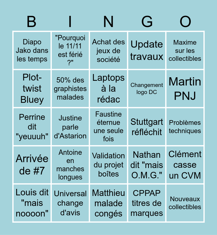 This bingo card has a free space and 24 words: Antoine en manches longues, Universal change d'avis, Laptops à la rédac, Louis dit "mais noooon", Maxime sur les collectibles, Diapo Jako dans les temps, Plot-twist Bluey, "Pourquoi le 11/11 est férié ?", Stuttgart réfléchit, Validation du projet boîtes, Changement logo DC, Perrine dit "yeuuuh", Nathan dit "mais O.M.G.", Clément casse un CVM, 50% des graphistes malades, CPPAP titres de marques, Problèmes techniques, Achat des jeux de société, Martin PNJ, Justine parle d'Astarion, Nouveaux collectibles, Arrivée de #7, Update travaux and Matthieu malade congés.