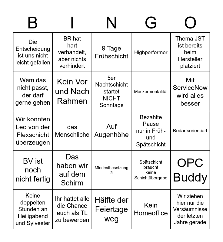 This bingo card has 30 words: Ihr hattet alle die Chance euch als TL zu bewerben, Undankbar, das Menschliche, Netterweise dürft ihr die zu Unrecht aufgebauten Überstunden behalten, Die Entscheidung ist uns nicht leicht gefallen, 9 Tage Frühschicht, Kein Vor und Nach Rahmen, Mindestbesetzung 3, Bezahlte Pause nur in Früh-und Spätschicht, Hälfte der Feiertage weg, Bedarfsorientiert, Auf Augenhöhe, Kein Homeoffice, Wir ziehen hier nur die Versäumnisse der letzten Jahre gerade, Mit ServiceNow wird alles besser, Urlaub bitte bis 30.11. einreichen, Spätschicht braucht keine Schichtübergabe, BV ist noch nicht fertig, Das haben wir auf dem Schirm, Thema JST ist bereits beim Hersteller platziert, Wir konnten Leo von der Flexschicht überzeugen, Ihr macht alle einen super Job, BR hat hart verhandelt, aber nichts verhindert, Meckermentalität, Wem das nicht passt, der darf gerne gehen, Highperformer, OPC Buddy, Keine doppelten Stunden an Heiligabend und Sylvester, 5er Nachtschicht startet NICHT Sonntags and Teamleiter macht weiter Nachtschichten.