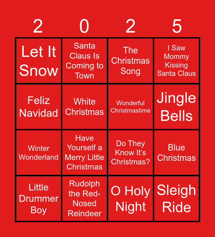 This bingo card has 25 words: All I Want for Christmas Is You, Last Christmas, Jingle Bells, Silent Night, Feliz Navidad, Let It Snow, White Christmas, Santa Claus Is Coming to Town, Rudolph the Red-Nosed Reindeer, Rockin’ Around the Christmas Tree, Winter Wonderland, Do They Know It’s Christmas?, It’s Beginning to Look a Lot Like Christmas, Driving Home for Christmas, Wonderful Christmastime, Hark! The Herald Angels Sing, O Holy Night, The Christmas Song, Have Yourself a Merry Little Christmas, Blue Christmas, Little Drummer Boy, Mary’s Boy Child, Sleigh Ride, I Saw Mommy Kissing Santa Claus and FREE SPACE.