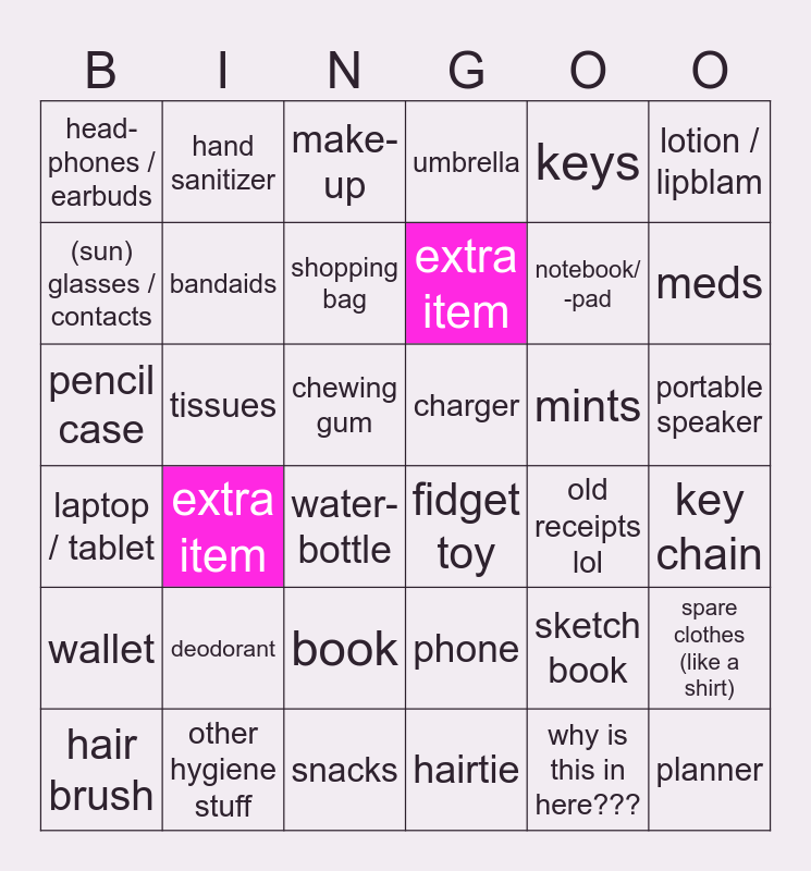 This bingo card has 36 words: phone, book, hairtie, (sun) glasses / contacts, laptop / tablet, charger, bandaids, snacks, keys, sketch book, meds, umbrella, spare clothes (like a shirt), tissues, extra item, head-phones / earbuds, wallet, mints, pencil case, make-up, chewing gum, extra item, fidget toy, water-bottle, old receipts lol, hand sanitizer, notebook/ -pad, other hygiene stuff, shopping bag, lotion / lipblam, planner, hair brush, key chain, portable speaker, deodorant and why is this in here???.