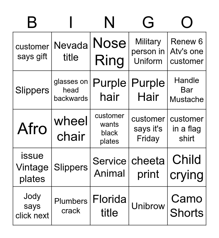This bingo card has a free space and 25 words: Jody says click next, Slippers, Purple hair, Unibrow, Handle Bar Mustache, customer says gift, Nevada title, Nose Ring, Purple Hair, Child crying, Afro, glasses on head backwards, cheeta print, Camo Shorts, Slippers, Plumbers crack, Florida title, Military person in Uniform, customer in a flag shirt, issue Vintage plates, wheel chair, Service Animal, customer says it's Friday, Renew 6 Atv's one customer and Mohawk.