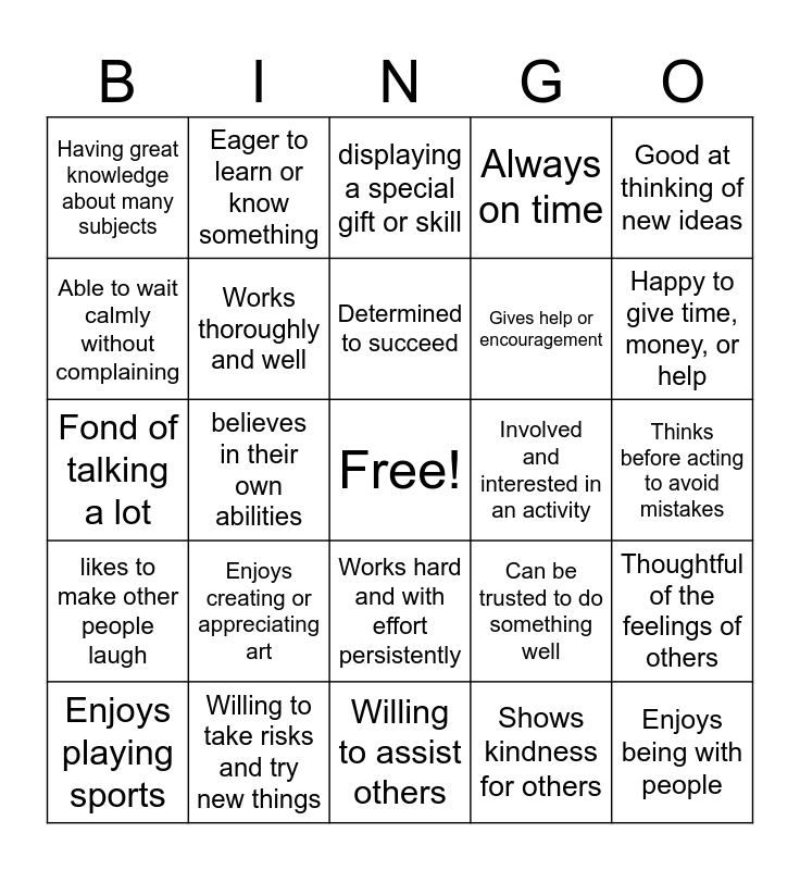 This bingo card has a free space and 24 words: Enjoys creating or appreciating art, Willing to take risks and try new things, Determined to succeed, Enjoys playing sports, Good at thinking of new ideas, Having great knowledge about many subjects, Able to wait calmly without complaining, Eager to learn or know something, Involved and interested in an activity, Works hard and with effort persistently, Gives help or encouragement, Fond of talking a lot, Can be trusted to do something well, Thoughtful of the feelings of others, Works thoroughly and well, Shows kindness for others, Thinks before acting to avoid mistakes, displaying a special gift or skill, Happy to give time, money, or help, believes in their own abilities, Enjoys being with people, likes to make other people laugh, Always on time and Willing to assist others.