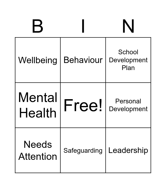 This bingo card has a free space and 24 words: Inclusion, SEND, Safeguarding, Curriculum, Leadership, Wellbeing, Personal Development, Behaviour, Attendance, Report Card, Grading Scale, Exceptional, Strong, Expected Standard, Needs Attention, Urgent Improvement, Self-Evaluation, School Development Plan, Staff Voice, Pupil Voice, Lived Experience, Workload, Mental Health and Governance.