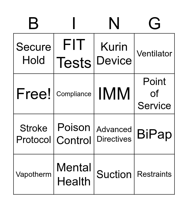 This bingo card has 37 words: Sedation, Propofol, MOT, IMM, Moon, Collections, Point of Service, EKG, Free!, Lucas, BiPap, Ventilator, Vapotherm, Suction, Compliance, Restraints, Blood Cultures, Kurin Device, 12 lead, Mental Health, Secure Hold, Poison Control, RL Datix, Handwashing, PPE, In Basket, FIT Tests, Flu Shots, EMTALA, Translation, Spanish, Pulsara, Advanced Directives, VRN, Medication Reconciliation, Stroke Protocol and Documentation.
