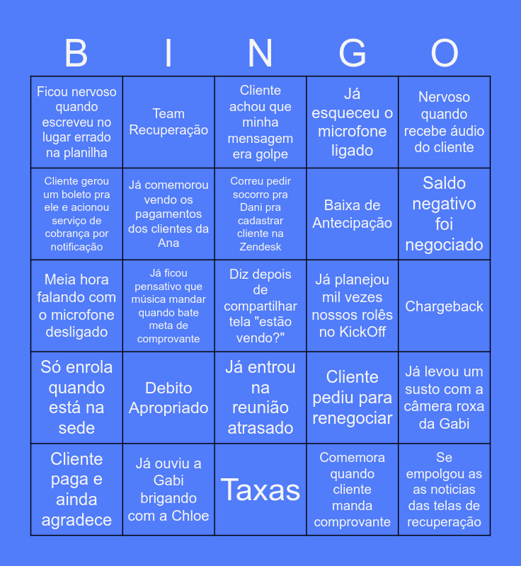 This bingo card has 35 words: Já falou "Estão me ouvindo?", Cliente disse “vou pagar amanhã”, Cliente diz que vai pensar na proposta, e retorna só depois do término da campanha de desconto, Já comemorou vendo os pagamentos dos clientes da Ana, Já entrou na reunião atrasado, Já esqueceu o microfone ligado, Cliente gerou um boleto pra ele e acionou serviço de cobrança por notificação, Já bocejou vendo a Gabi bocejar?, Correu pedir socorro pra Dani pra cadastrar cliente na Zendesk, Ficou ansioso para contar um babado do final de semana na daily de segunda, Meia hora falando com o microfone desligado, Nervoso quando recebe áudio do cliente, Nervosismo quando a Dassa manda mensagem no "Squad Recuperação", Já ficou horas com o status de "cafezinho", Ficou nervoso quando escreveu no lugar errado na planilha, Já planejou mil vezes nossos rolês no KickOff, Comemora quando cliente manda comprovante, Já ficou pensativo que música mandar quando bate meta de comprovante, Só enrola quando está na sede, Diz depois de compartilhar tela "estão vendo?", Cliente pediu para renegociar, Cliente paga e ainda agradece, Já levou um susto com a câmera roxa da Gabi, Já ouviu a Gabi brigando com a Chloe, Cliente achou que minha mensagem era golpe, Saldo negativo foi negociado, Se empolgou as as noticias das telas de recuperação, Boleto, Baixa de Antecipação, Chargeback, Zendesk, Taxas, Debito Apropriado, Team Recuperação and Cobrança Master.