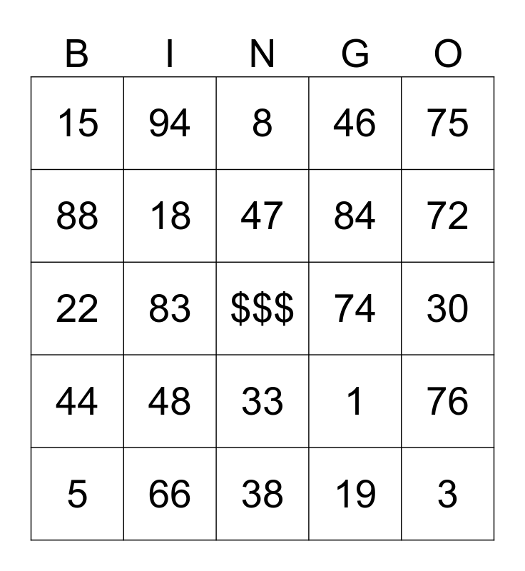 This bingo card has a free space and 24 words: 48, 66, 47, 5, 75, 15, 88, 94, 74, 33, 84, 22, 1, 76, 18, 19, 30, 8, 72, 83, 3, 44, 46 and 38.
