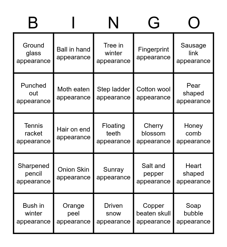 This bingo card has 25 words: Onion Skin appearance, Driven snow appearance, Step ladder appearance, Bush in winter appearance, Sausage link appearance, Ground glass appearance, Punched out appearance, Ball in hand appearance, Cherry blossom appearance, Sunray appearance, Cotton wool appearance, Tennis racket appearance, Salt and pepper appearance, Heart shaped appearance, Moth eaten appearance, Soap bubble appearance, Honey comb appearance, Tree in winter appearance, Pear shaped appearance, Hair on end appearance, Floating teeth appearance, Orange peel appearance, Sharpened pencil appearance, Fingerprint appearance and Copper beaten skull appearance.