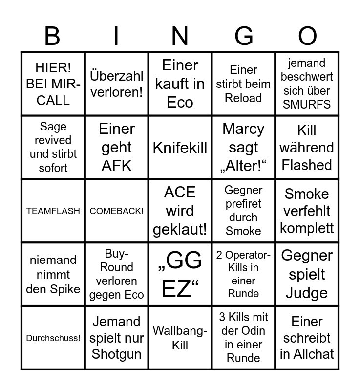 This bingo card has a free space and 24 words: Durchschuss!, Buy-Round verloren gegen Eco, Knifekill, 3 Kills mit der Odin in einer Runde, jemand beschwert sich über SMURFS, HIER! BEI MIR- CALL, Überzahl verloren!, Einer kauft in Eco, Gegner prefiret durch Smoke, Smoke verfehlt komplett, TEAMFLASH, Einer geht AFK, 2 Operator-Kills in einer Runde, Gegner spielt Judge, Sage revived und stirbt sofort, Jemand spielt nur Shotgun, Wallbang-Kill, Einer stirbt beim Reload, Kill während Flashed, niemand nimmt den Spike, COMEBACK!, „GG EZ“, Marcy sagt „Alter!“ and Einer schreibt in Allchat.