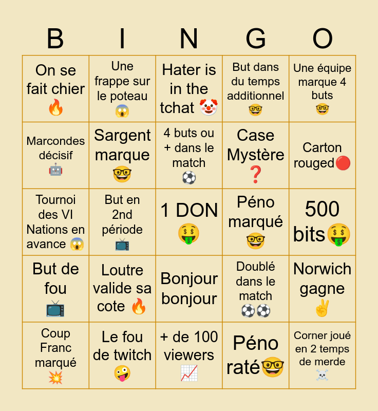 This bingo card has a free space and 38 words: Génération d'image valided 😂, Les 2 équipes marquent, Le match est interrompu, Sargent marque 🤓, Norwich gagne ✌️, Loutre valide sa cote 🔥, 4 buts ou + dans le match ⚽️, Watford gagne 🔥, Une équipe marque 4 buts 🤓, Case Mystère ❓, But en 2nd période 📺, But dans du temps additionnel 🤓, Corner joué en 2 temps de merde ☠️, 500 bits🤑, Marcondes décisif 🤖, But de fou 📺, Mclean marque ⚽️, Hater is in the tchat 🤡, RBF fait un 50 au chamboule tout qui chamboule tout⚽️, Péno marqué🤓, On se fait chier 🔥, Le fou de twitch 🤪, Carton rouged🔴, Coup Franc marqué 💥, RBF a un Roland Courbis 🍷, + de 100 viewers 📈, Prince marque + de 1,02 pts dans la compétition😱, Quelqu'un marque une cote à + de 10 🏆, Var qui prend 1000 ans 🔁, 5 Personnes ou + marquent des pts dans la compétition😱, RBF est atterré par les jeux de mots🤓, Bonjour bonjour, Péno raté🤓, Une frappe sur le poteau 😱, Watford marque ⚽️, Doublé dans le match ⚽️⚽️, Tournoi des VI Nations en avance 😱 and 0-0 à la mi-temps 💤.