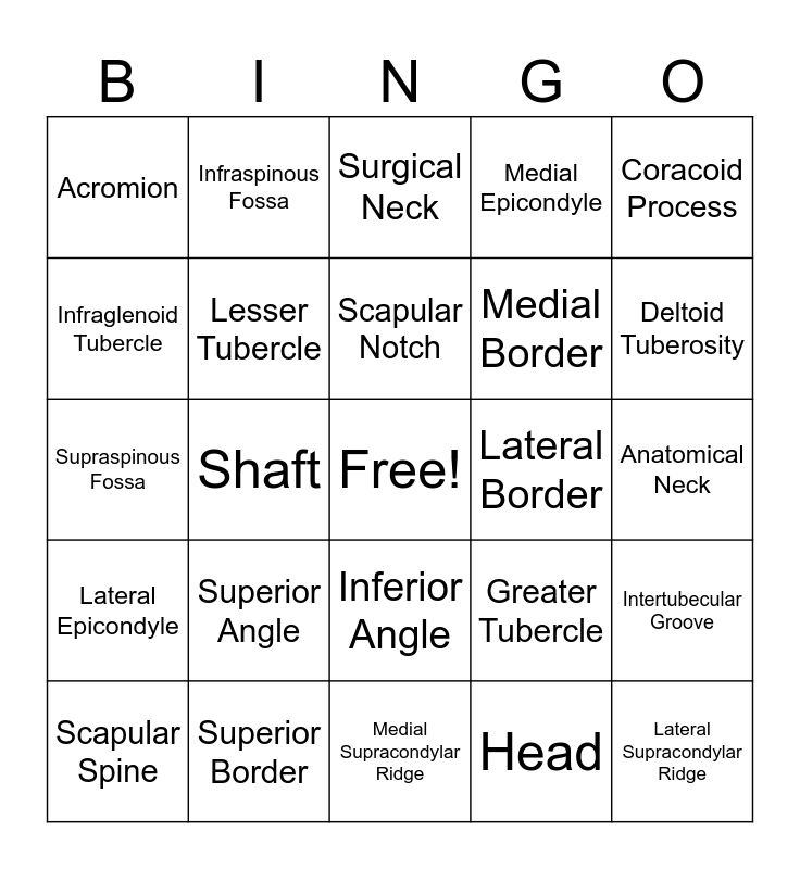 This bingo card has a free space and 24 words: Superior Angle, Superior Border, Scapular Notch, Scapular Spine, Coracoid Process, Acromion, Infraglenoid Tubercle, Infraspinous Fossa, Lateral Border, Inferior Angle, Medial Border, Supraspinous Fossa, Greater Tubercle, Intertubecular Groove, Lesser Tubercle, Head, Anatomical Neck, Surgical Neck, Deltoid Tuberosity, Shaft, Lateral Supracondylar Ridge, Lateral Epicondyle, Medial Epicondyle and Medial Supracondylar Ridge.