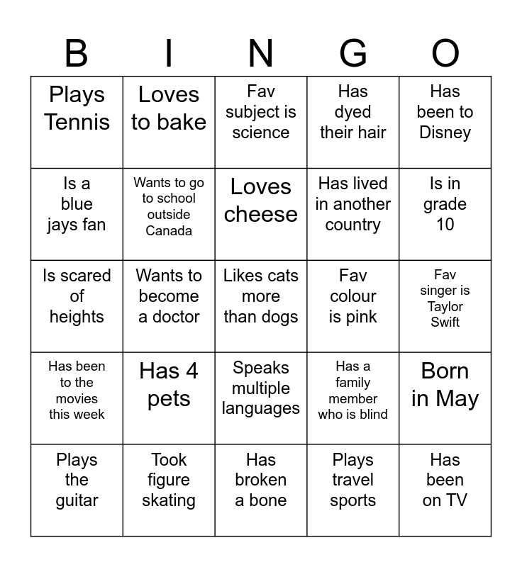 This bingo card has a free space and 24 words: Has 4 pets, Took figure skating, Loves cheese, Plays the guitar, Has been to Disney, Plays Tennis, Is a blue jays fan, Loves to bake, Fav colour is pink, Speaks multiple languages, Has lived in another country, Is scared of heights, Has a family member who is blind, Born in May, Wants to go to school outside Canada, Plays travel sports, Fav singer is Taylor Swift, Fav subject is science, Is in grade 10, Wants to become a doctor, Has been on TV, Has been to the movies this week, Has dyed their hair and Has broken a bone.