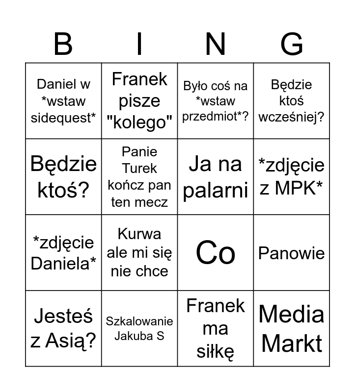 This bingo card has 20 words: Panowie, XDDDDDD, Było coś na *wstaw przedmiot*?, *6 min głosówka Aleksego*, Jesteś z Asią?, Będzie ktoś?, Szkalowanie Jakuba S, Daniel w *wstaw sidequest*, *zdjęcie Daniela*, Franek pisze "kolego", Kurwa ale mi się nie chce, Co, Panie Turek kończ pan ten mecz, Media Markt, Ja na palarni, Macie kod do *wstaw przedmiot*?, *zdjęcie z MPK*, Będzie ktoś wcześniej?, Franek ma siłkę and Piękna sprawa.