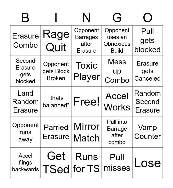 This bingo card has a free space and 24 words: Parried Erasure, Get TSed, Toxic Player, Accel flings backwards, Pull gets blocked, Erasure Combo, Second Erasure gets blocked, Rage Quit, Accel Works, Mirror Match, Mess up Combo, Land Random Erasure, Pull into Barrage after combo, Vamp Counter, Opponent gets Block Broken, Pull misses, Random Second Erasure, Opponent Barrages after Erasure, Erasure gets Canceled, "thats balanced", Lose, Opponent runs away, Opponent uses an Obnoxious Build and Runs for TS.