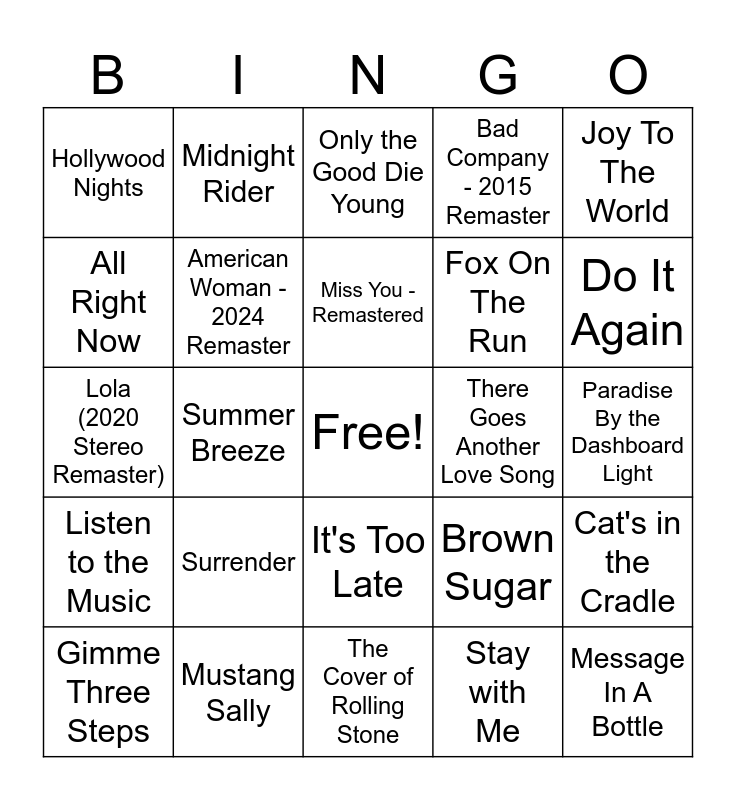 This bingo card has a free space and 75 words: Walk This Way, Don't Stop - 2004 Remaster, Only the Good Die Young, The Logical Song - Remastered 2010, Stuck In The Middle With You, More Than a Feeling, Saturday Nightâs Alright (For Fighting) - Remastered 2014, Heartache Tonight - 2013 Remaster, American Pie, The Things We Do For Love, Some Kind Of Wonderful - Remastered 1999, Rich Girl, Miss You - Remastered, All Right Now, Don't Let The Sun Go Down On Me - Remastered 1995, Summer Breeze, My Life, Message In A Bottle, Say You Love Me, Joy To The World, Up Around The Bend, Lola (2020 Stereo Remaster), American Woman - 2024 Remaster, Midnight Rider, Bad Company - 2015 Remaster, Guitar Man, Tush (2006 Remaster), Rebel Rebel - 2016 Remaster, You Make Loving Fun - 2004 Remaster, You Sexy Thing, Baker Street, December, 1963 (Oh What a Night!), Night Fever - From Saturday Night Fever Soundtrack, Brown Sugar, Do It Again, Fox On The Run, You're No Good, Night Moves, Paradise By the Dashboard Light, Stay with Me, Free Ride, Running on Empty, Hair Of The Dog, Good Times Roll, Baba O'Riley, Life in the Fast Lane - 2013 Remaster, Gimme Three Steps, Hollywood Nights, We're An American Band - Remastered 2002, Knockin' On Heaven's Door, Sweet Home Alabama, It's Too Late, Badlands, Dancing Queen, Two Words, Stumblin' In - 2017 Remaster, Sultans Of Swing, I Got a Name - Stereo Version, Every Little Thing She Does Is Magic, Can't Get Enough Of Your Love, Babe, Surrender, Living Next Door to Alice, Take on the World, A Thing Called Love, What Can I Say, There Goes Another Love Song, Rock the Boat, Sometimes When We Touch, Laughter In The Rain, Cat's in the Cradle, Listen to the Music, Mustang Sally, Cherry, Cherry, The Cover of Rolling Stone and Jump in the Line.
