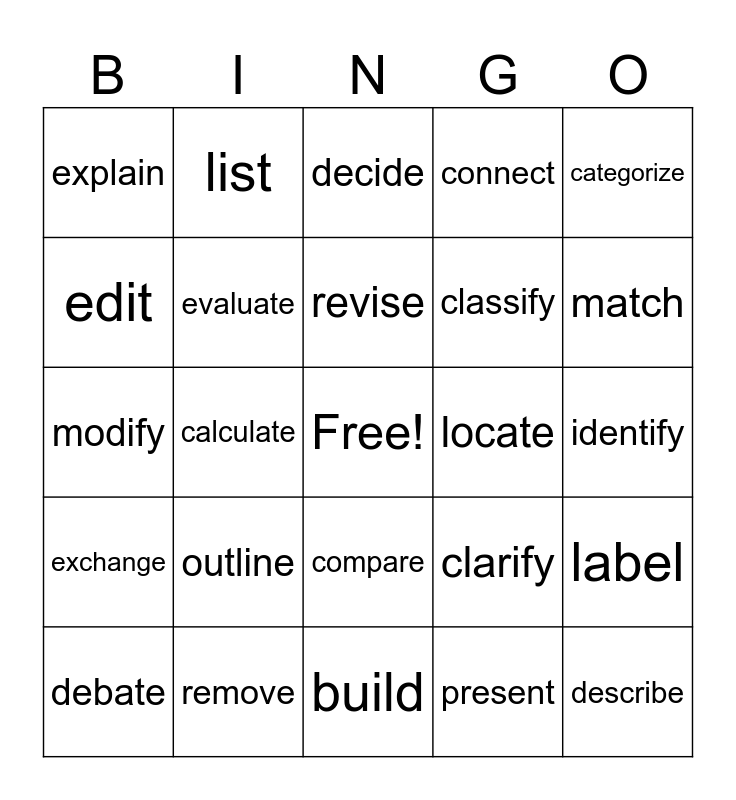This bingo card has a free space and 27 words: clarify, illustrate, classify, build, edit, decide, list, exchange, locate, label, modify, connect, debate, remove, match, exclude, evaluate, revise, outline, explain, identify, present, calculate, describe, compare, categorize and elaborate.