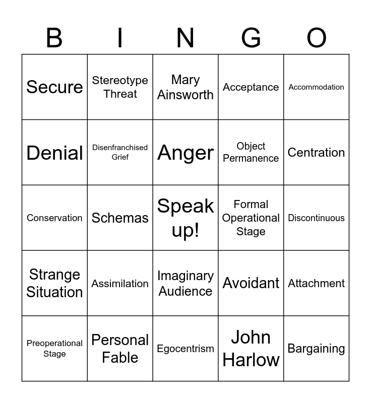 This bingo card has a free space and 29 words: Preoperational Stage, Jean Piaget, Schemas, Ageism, Secure, Mary Ainsworth, Disenfranchised Grief, Assimilation, Formal Operational Stage, Personal Fable, Discontinuous, Bargaining, Egocentrism, John Harlow, Centration, Sensorimotor Stage, Imaginary Audience, Strange Situation, Accommodation, Conservation, Avoidant, Concrete Operational Stage, Object Permanence, Denial, Acceptance, Stereotype Threat, Attachment, Anger and Reversibility.