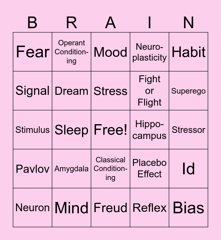This bingo card has a free space and 29 words: Brain, Mind, Mood, Memory, Habit, Fear, Dream, Stress, Hippo-campus, Id, Neuron, Sleep, Reflex, Bias, Stimulus, Ego, Freud, Placebo Effect, Superego, Pavlov, Amygdala, Dopamine, Fight or Flight, Stressor, Signal, Operant Condition- ing, Classical Condition-ing, Neuro- plasticity and Cognitive Disson- ance.