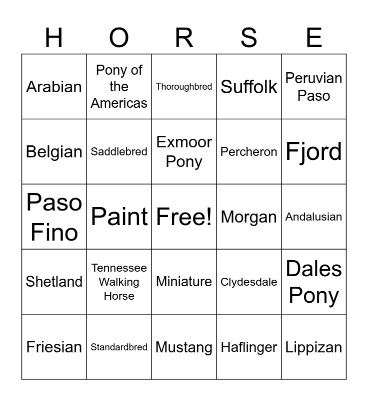 This bingo card has a free space and 29 words: Friesian, Quarter Horse, Paint, Appaloosa, Arabian, Thoroughbred, Saddlebred, Tennessee Walking Horse, Morgan, Standardbred, Andalusian, Lippizan, Mustang, Haflinger, Fjord, Hackney, Miniature, Shetland, Peruvian Paso, Paso Fino, Clydesdale, Shire, Percheron, Belgian, Suffolk, Pony of the Americas, Dales Pony, Exmoor Pony and Fell Pony.