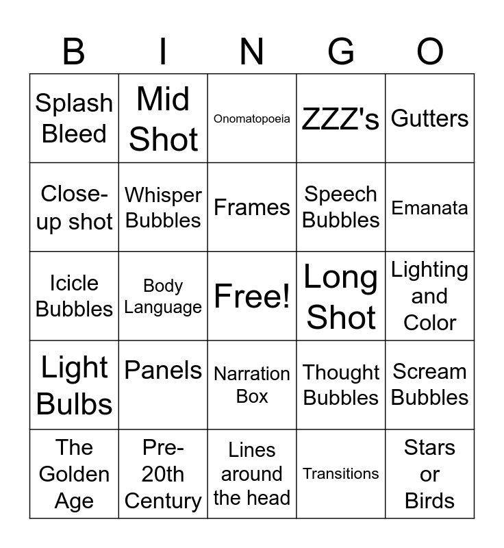 This bingo card has a free space and 24 words: Panels, Pre-20th Century, Frames, The Golden Age, Gutters, Splash Bleed, Close-up shot, Mid Shot, Long Shot, Narration Box, Speech Bubbles, Icicle Bubbles, Thought Bubbles, Scream Bubbles, Whisper Bubbles, Transitions, Lighting and Color, Onomatopoeia, Emanata, Body Language, Stars or Birds, Light Bulbs, ZZZ's and Lines around the head.