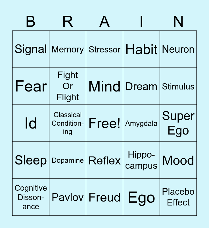 This bingo card has a free space and 29 words: Cognitive Disson-ance, Neuro Plastic-ity, Classical Condition-ing, Operant Condition-ing, Signal, Stressor, Fight Or Flight, Dopamine, Amygdala, Pavlov, Super Ego, Placebo Effect, Freud, Ego, Stimulus, Bias, Reflex, Sleep, Neuron, Id, Hippo- campus, Stress, Dream, Fear, Habit, Memory, Mood, Mind and Brain.