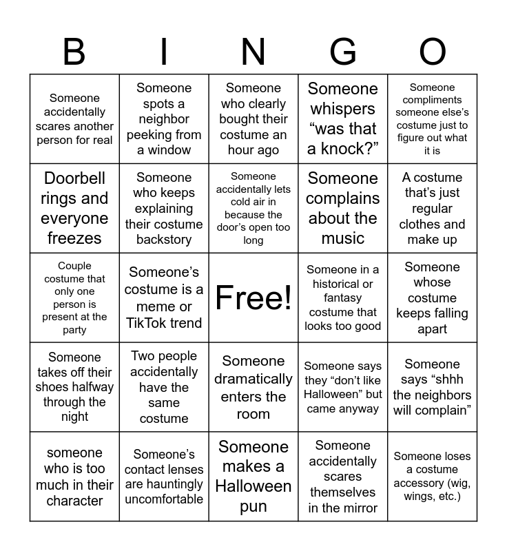 This bingo card has a free space and 29 words: someone who is too much in their character, Someone says “Guess what I am” and no one can guess, Someone’s costume is a meme or TikTok trend, A movie character everyone instantly recognizes, Someone accidentally scares another person for real, Someone who clearly bought their costume an hour ago, Someone who keeps explaining their costume backstory, Two people accidentally have the same costume, Someone in a historical or fantasy costume that looks too good, Someone’s contact lenses are hauntingly uncomfortable, Someone whose costume keeps falling apart, Someone loses a costume accessory (wig, wings, etc.), Someone makes a Halloween pun, Someone accidentally scares themselves in the mirror, A costume that’s just regular clothes and make up, Spilled drink on a costume, Someone dramatically enters the room, Someone takes off their shoes halfway through the night, Someone compliments someone else’s costume just to figure out what it is, Couple costume that only one person is present at the party, Someone says they “don’t like Halloween” but came anyway, Someone fake screams when they see something not scary, Someone complains about the music, Doorbell rings and everyone freezes, Someone whispers “was that a knock?”, Someone spots a neighbor peeking from a window, Someone says “shhh the neighbors will complain”, Someone accidentally lets cold air in because the door’s open too long and Someone smokes in the backyard and starts deep talking.