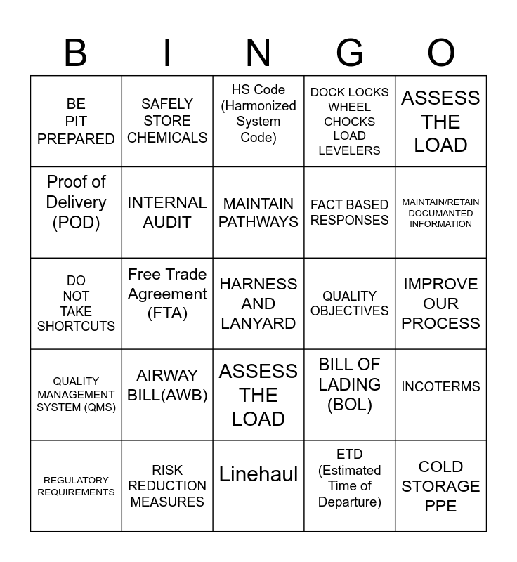 This bingo card has 30 words: RISK REDUCTION MEASURES, FCL (Full Container Load ), Free Trade Agreement (FTA), ITN Number, BE PIT PREPARED, HS Code (Harmonized System Code), INTERNAL AUDIT, ASSESS THE LOAD, QUALITY OBJECTIVES, Linehaul, IMPROVE OUR PROCESS, HARNESS AND LANYARD, ETD (Estimated Time of Departure), COLD STORAGE PPE, MAINTAIN/RETAIN DOCUMANTED INFORMATION, LTL (Less-than-Truckload), BILL OF LADING (BOL), QUALITY MANAGEMENT SYSTEM (QMS), AIRWAY BILL(AWB), ASSESS THE LOAD, DO NOT TAKE SHORTCUTS, CAPA – CORRECTIVE ACTION – PREVENTATIVE ACTION, SAFELY STORE CHEMICALS, FACT BASED RESPONSES, Proof of Delivery (POD), DOCK LOCKS WHEEL CHOCKS LOAD LEVELERS, INCOTERMS, REGULATORY REQUIREMENTS, MAINTAIN PATHWAYS and Ocean Shipment.