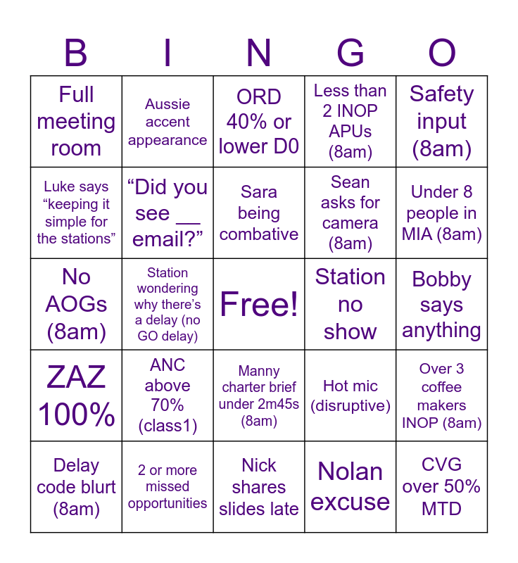 This bingo card has a free space and 24 words: ANC above 70% (class1), 2 or more missed opportunities, Sara being combative, Delay code blurt (8am), Safety input (8am), Full meeting room, Luke says “keeping it simple for the stations”, Aussie accent appearance, Station no show, Manny charter brief under 2m45s (8am), Sean asks for camera (8am), No AOGs (8am), Hot mic (disruptive), Over 3 coffee makers INOP (8am), “Did you see __ email?”, Nolan excuse, Bobby says anything, ORD 40% or lower D0, Under 8 people in MIA (8am), Station wondering why there’s a delay (no GO delay), CVG over 50% MTD, ZAZ 100%, Less than 2 INOP APUs (8am) and Nick shares slides late.