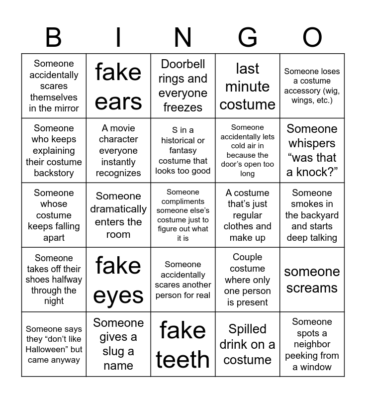 This bingo card has 35 words: someone who is too much in their character, Someone says “Guess what I am” and no one can guess it, Someone’s costume is a meme or TikTok trend, A movie character everyone instantly recognizes, Someone accidentally scares another person for real, last minute costume, Someone who keeps explaining their costume backstory, Two people accidentally have the same costume, S in a historical or fantasy costume that looks too good, Someone’s contact lenses are hauntingly uncomfortable, Someone whose costume keeps falling apart, Someone loses a costume accessory (wig, wings, etc.), Someone screams because of a spider or leaf, Someone makes a Halloween pun, Someone accidentally scares themselves in the mirror, A costume that’s just regular clothes and make up, Spilled drink on a costume, Someone dramatically enters the room, Someone takes off their shoes halfway through the night, Someone compliments someone else’s costume just to figure out what it is, Couple costume where only one person is present, Someone says they “don’t like Halloween” but came anyway, someone screams, Someone gives a slug a name, Doorbell rings and everyone freezes, Someone whispers “was that a knock?”, Someone spots a neighbor peeking from a window, fruit, Someone accidentally lets cold air in because the door’s open too long, Someone smokes in the backyard and starts deep talking, fake blood, fake teeth, fake eyes, fake ears and candy.