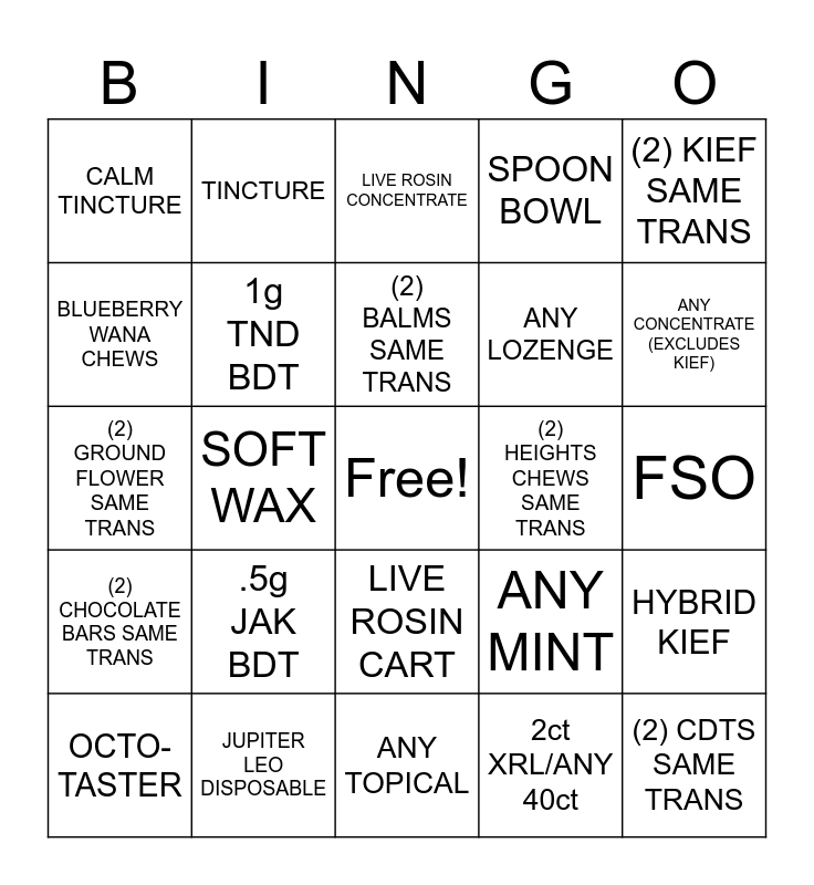 This bingo card has a free space and 26 words: LIVE ROSIN CART, 2ct XRL/ANY 40ct, (2) BALMS SAME TRANS, JUPITER LEO DISPOSABLE, (2) KIEF SAME TRANS, CALM TINCTURE, BLUEBERRY WANA CHEWS, TINCTURE, FSO, ANY MINT, ANY LOZENGE, (2) GROUND FLOWER SAME TRANS, HYBRID KIEF, OCTO-TASTER, SOFT WAX, DISTILLATE EXTRACT, SPOON BOWL, (2) CHOCOLATE BARS SAME TRANS, LIVE ROSIN CONCENTRATE, (2) CDTS SAME TRANS, ANY CONCENTRATE (EXCLUDES KIEF), ANY TOPICAL, (2) HEIGHTS CHEWS SAME TRANS, .5g JAK BDT, 1g TND BDT and $70+ AFTER DISCOUNT.