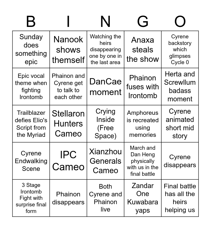 This bingo card has a free space and 24 words: IPC Cameo, Phainon disappears, DanCae moment, 3 Stage Irontomb Fight with surprise final form, Cyrene backstory which glimpses Cycle 0, Sunday does something epic, Epic vocal theme when fighting Irontomb, Nanook shows themself, Amphoreus is recreated using memories, Xianzhou Generals Cameo, Phainon fuses with Irontomb, Trailblazer defies Elio's Script from the Myriad, March and Dan Heng physically with us in the final battle, Cyrene disappears, Phainon and Cyrene get to talk to each other, Zandar One Kuwabara yaps, Cyrene animated short mid story, Watching the heirs disappearing one by one in the last area, Herta and Screwllum badass moment, Stellaron Hunters Cameo, Final battle has all the heirs helping us, Cyrene Endwalking Scene, Anaxa steals the show and Both Cyrene and Phainon live.