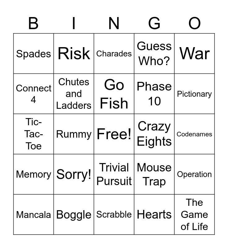 This bingo card has a free space and 50 words: Monopoly, The Game of Life, Clue, Scrabble, Sorry!, Trouble, Risk, Battleship, Connect 4, Candy Land, Chutes and Ladders, Guess Who?, Operation, Mouse Trap, Stratego, Uno, Go Fish, Crazy Eights, Old Maid, War, Rummy, Hearts, Spades, Phase 10, Skip-Bo, Apples to Apples, Pictionary, Taboo, Charades, Trivial Pursuit, Yahtzee, Farkle, Liar’s Dice, Dominoes, Boggle, Scattergories, Balderdash, Cranium, Sequence, Codenames, Chess, Checkers, Backgammon, Othello, Mancala, Tic-Tac-Toe, Jenga, Gin Rummy, Memory and Parcheesi.
