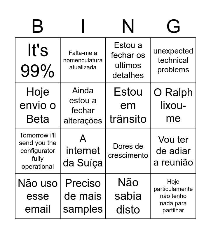 This bingo card has 16 words: Preciso de mais samples, Vou ter de adiar a reunião, Estou a fechar os ultimos detalhes, It's 99%, Tomorrow i'll send you the configurator fully operational, Falta-me a nomenculatura atualizada, Dores de crescimento, Não sabia disto, Hoje envio o Beta, Ainda estou a fechar alterações, Não uso esse email, unexpected technical problems, A internet da Suíça, O Ralph lixou-me, Estou em trânsito and Hoje particulamente não tenho nada para partilhar.