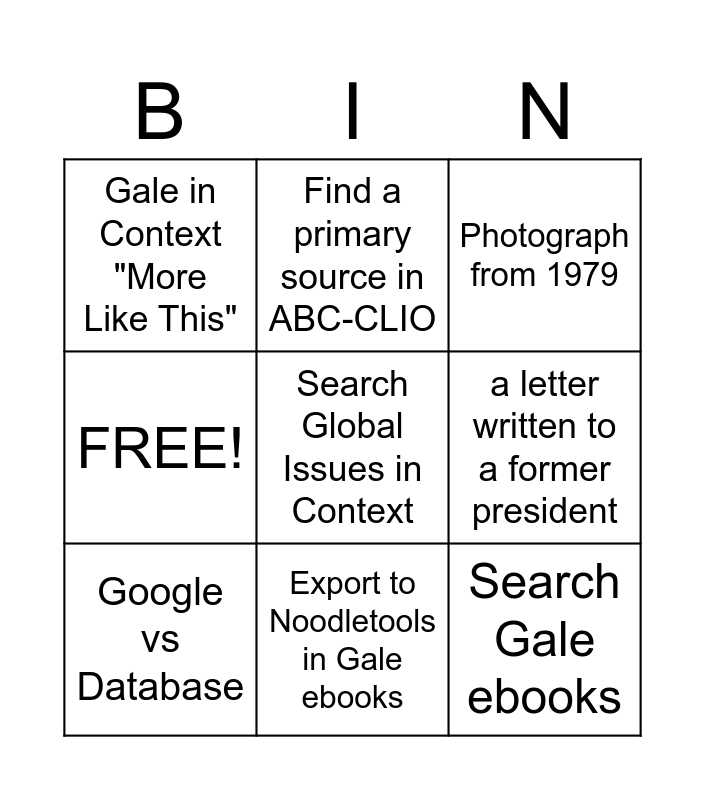 This bingo card has 13 words: Export to Noodletools in Global Issues in Context, Export to Noodletools in ABC-CLIO, Google vs Database, Find a primary source in ABC-CLIO, FREE!, Search Global Issues in Context, Search Gale ebooks, Find a primary source in ABC-CLIO, Export to Noodletools in Gale ebooks, Gale in Context "More Like This", a letter written to a former president, Photograph from 1979 and Audio clip of Martin Luther King, Jr. speaking.