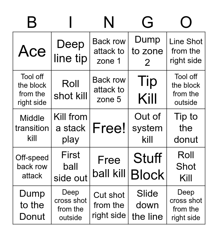 This bingo card has a free space and 29 words: Dump to the Donut, Line Shot from the Outside, Kill from a stack play, Dump to deep 5, Ace, Back row attack to zone 1, Roll shot kill, First ball side out, Out of system kill, Deep cross shot from the outside, Tip to the donut, Deep cross shot from the right side, Cut shot from the right side, Slide down the line, Tool off the block from the outside, Setter gets 1 on 1, Free ball kill, Off-speed back row attack, Line Shot from the right side, Middle transition kill, Stuff Block, Dump to zone 2, Tip Kill, Tool off the block from the right side, Dump to zone 2, Deep line tip, Roll Shot Kill, Back row attack to zone 5 and Overpass Kill.