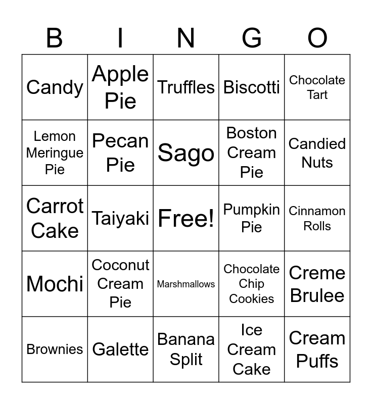 This bingo card has a free space and 71 words: Almong Torte, Apple Pie, Baklava, Banana Bread, Banana Split, Beignets, Biscotti, Blueberry Cobbler, Boston Cream Pie, Bread Pudding, Brownies, Bundt Cake, Candied Nuts, Candy, Caramel, Carrot Cake, Chocolate Chip Cookies, Chocolate Tart, Churros, Cinnamon Rolls, Coconut Cream Pie, Cream Puffs, Creme Brulee, Cupcakes, Custard, Donuts, Dump Cake, Flan, Fudge, Funnel Cake, Galette, Gelato, Hot Chocolate, Ice Cream, Ice Cream Cake, Jelly Roll, Key Lime Pie, Lava Cake, Lemon Meringue Pie, Macarons, Marshmallows, Mille-feuille, Mochi, Mousse, Muffin, Oatmeal Cream Pie, Pavlova, Pecan Pie, Poke Cake, Posset, Pralines, Pudding, Pumpkin Pie, Puppy Chow, Red Velvet Cake, S'mores, Sago, Scones, Scotcharoos, Sherbet, Sticky Toffee Pudding, Sugar Cookies, Taiyaki, Tangulu, Tiramisu, Tres Leches, Truffles, Wedding Cake, Whoopie Pies, Zebra Cakes and Cotton Candy.