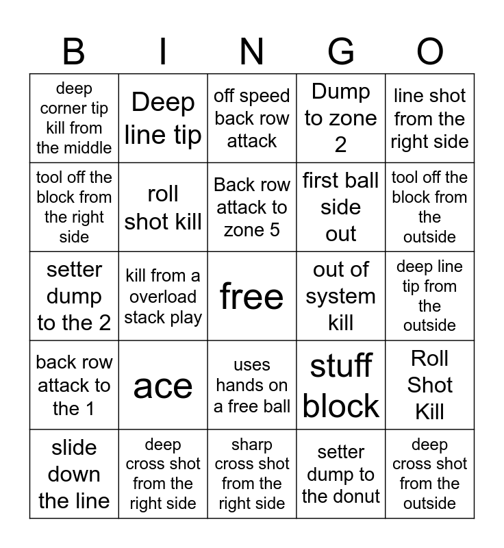 This bingo card has a free space and 29 words: slide down the line, line shot from the outside, kill from a overload stack play, setter dump to deep 5, deep corner tip kill from the middle, off speed back row attack, roll shot kill, ace, out of system kill, deep cross shot from the right side, deep line tip from the outside, deep cross shot from the outside, sharp cross shot from the right side, setter dump to the donut, tool off the block from the outside, setter gets 1 on 1, uses hands on a free ball, back row attack to the 1, line shot from the right side, setter dump to the 2, stuff block, middle transition kill, first ball side out, tool off the block from the right side, Dump to zone 2, Deep line tip, Roll Shot Kill, Back row attack to zone 5 and Overpass Kill.