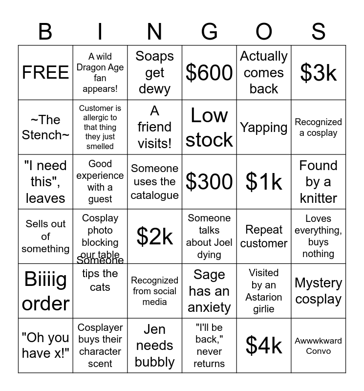 This bingo card has 36 words: Sage has an anxiety, Recognized from social media, "I'll be back," never returns, ~The Stench~, Sells out of something, $300, Customer is allergic to that thing they just smelled, Jen needs bubbly, Actually comes back, Visited by an Astarion girlie, Recognized a cosplay, $600, Mystery cosplay, Good experience with a guest, Low stock, FREE, Biiiig order, $1k, "I need this", leaves, Soaps get dewy, Someone uses the catalogue, Cosplay photo blocking our table, Someone talks about Joel dying, $2k, Repeat customer, A wild Dragon Age fan appears!, Yapping, Cosplayer buys their character scent, A friend visits!, $3k, Awwwkward Convo, "Oh you have x!", Loves everything, buys nothing, Found by a knitter, Someone tips the cats and $4k.