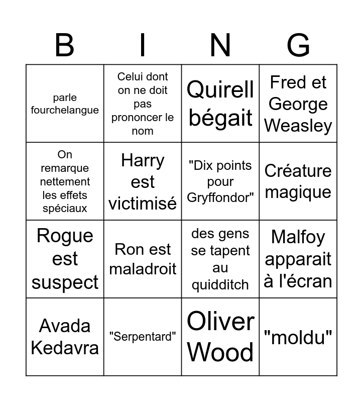 This bingo card has 16 words: "Serpentard", Malfoy apparait à l'écran, Quirell bégait, parle fourchelangue, Rogue est suspect, Celui dont on ne doit pas prononcer le nom, des gens se tapent au quidditch, Oliver Wood, On remarque nettement les effets spéciaux, Harry est victimisé, Avada Kedavra, Fred et George Weasley, Ron est maladroit, Créature magique, "Dix points pour Gryffondor" and "moldu".