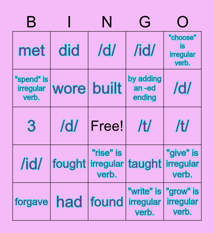 This bingo card has a free space and 24 words: fought, had, built, forgave, "choose" is irregular verb., met, "spend" is irregular verb., did, /t/, "rise" is irregular verb., by adding an -ed ending, 3, taught, "give" is irregular verb., wore, "write" is irregular verb., /t/, /d/, /d/, /d/, "grow" is irregular verb., /id/, /id/ and found.