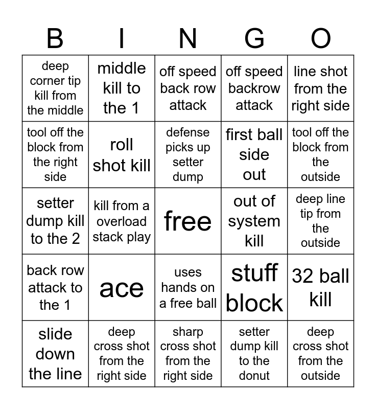This bingo card has a free space and 29 words: slide down the line, line shot from the outside, kill from a overload stack play, setter dump to deep 5, deep corner tip kill from the middle, off speed back row attack, roll shot kill, ace, out of system kill, deep cross shot from the right side, deep line tip from the outside, deep cross shot from the outside, sharp cross shot from the right side, setter dump kill to the donut, tool off the block from the outside, setter gets 1 on 1, uses hands on a free ball, back row attack to the 1, line shot from the right side, setter dump kill to the 2, stuff block, middle transition kill, first ball side out, tool off the block from the right side, off speed backrow attack, middle kill to the 1, 32 ball kill, defense picks up setter dump and overpass kill.