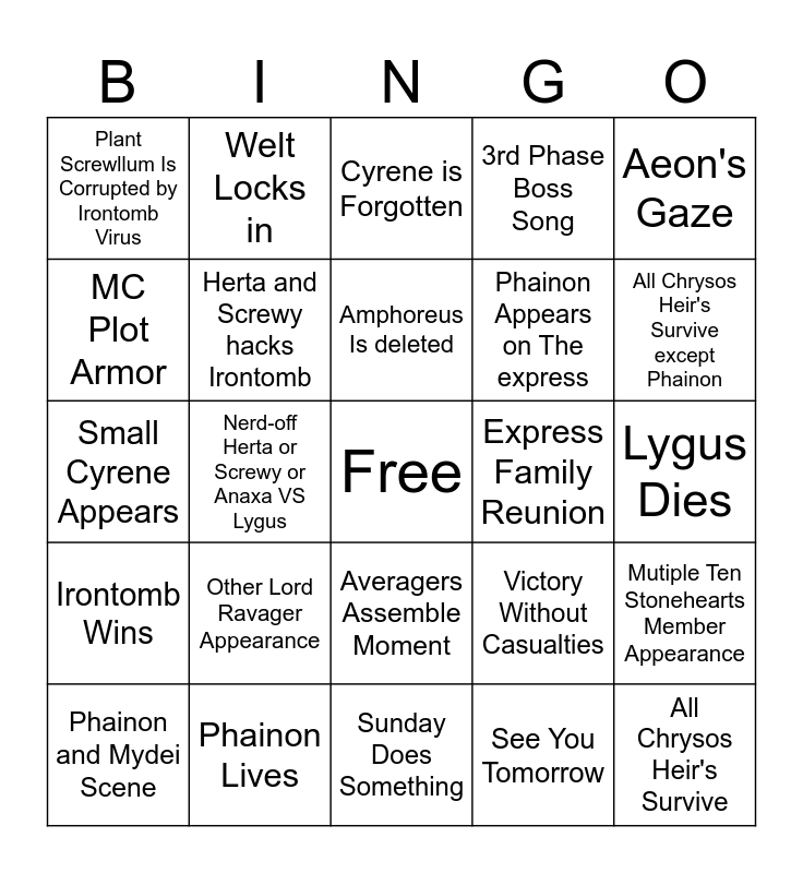 This bingo card has a free space and 24 words: Other Lord Ravager Appearance, Phainon Lives, Amphoreus Is deleted, Phainon and Mydei Scene, Aeon's Gaze, Plant Screwllum Is Corrupted by Irontomb Virus, MC Plot Armor, Welt Locks in, Express Family Reunion, Averagers Assemble Moment, Phainon Appears on The express, Small Cyrene Appears, Victory Without Casualties, Mutiple Ten Stonehearts Member Appearance, Herta and Screwy hacks Irontomb, See You Tomorrow, Lygus Dies, Cyrene is Forgotten, All Chrysos Heir's Survive except Phainon, Nerd-off Herta or Screwy or Anaxa VS Lygus, All Chrysos Heir's Survive, Irontomb Wins, 3rd Phase Boss Song and Sunday Does Something.